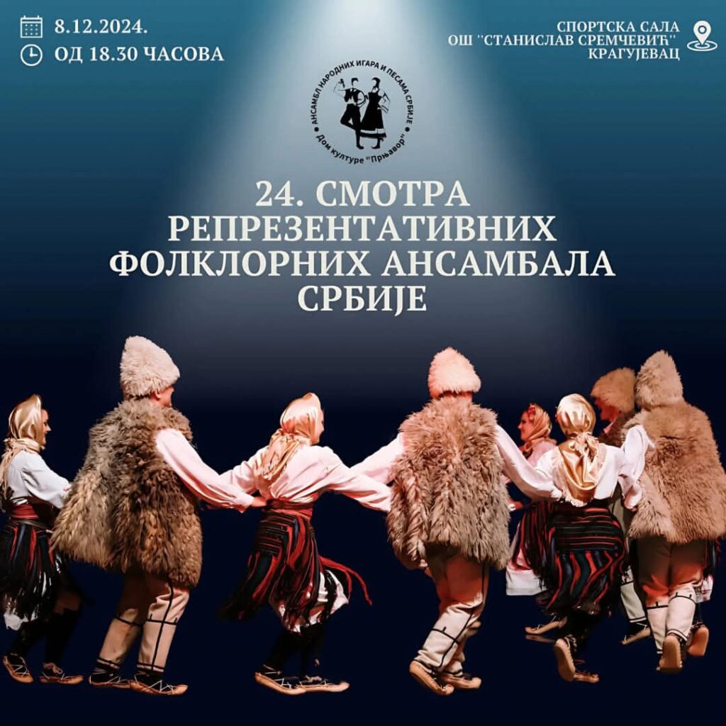 Ове године наш први-извођачки ансамбл учествује на 24. Смотри фолклорних ансамбала Србије, која се одржава 7. и 8. децембра у Крагујевцу, у организацији Централног савеза аматера у култури Србије.